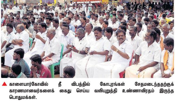 சிவகங்கை மாவட்டம் காளையார்கோவிலில் தீ விபத்தில் கோபுரங்கள் சேதமடைந்ததற்குக் காரணமானவர்களைக் கைது செய்ய வலியுறுத்தி, அதிமுக- வினர் உட்பட ஆயிரக்கணக்கா னோர் நேற்று உண்ணாவிரதம் இருந்தனர். இந்த சம்பவம் தொடர்பாக அதிமுக பிரமுகர்கள் 2 பேர் கைது செய்யப்பட்டனர்.