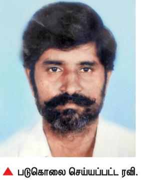 இந்நிலையில், நேற்று மதியம், பெருமாள்பட்டு அருகே உள்ள கொட்டாம்பேடுவில் வாடிக்கை யாளர் ஒருவருக்கு தன் மோட்டார் சைக்கிளில் சிமென்ட் மூட்டைகளை அளித்துவிட்டு, கடைக்கு திரும்பிக் கொண்டிருந்தார். அப்போது பெருமாள்பட்டு ஊராட்சி அலுவலகம் அருகே, 4 பேர் கொண்ட மர்ம கும்பல் 2 மோட்டார் சைக்கிள்களில் ரவியை பின்தொடர்ந்து வந்துள்ளது. அந்த கும்பல் ரவியை அரிவாளால் சரமாரியாக வெட்டி படுகொலை செய்துவிட்டு தப்பியோடி விட்டது.