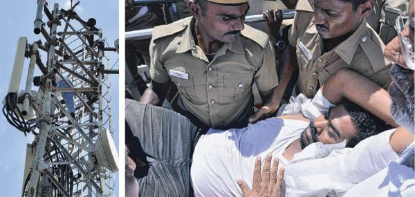 முதல்வர் ஜெயலலிதாவை அவதூறாக பேசியதாகக் கூறி காங்கிரஸ் கட்சியின் மாநில தலைவர் ஈவிகேஎஸ் இளங்கோவனுக்கு எதிராக அதிமுகவினரும், அதிமுகவிற்கு எதிராக காங்கிரஸ் கட்சியினரும் கடந்த 3 நாட்களாக பல்வேறு போராட்டங்களை நடத்தி வருகின்றனர். இந்நிலையில் நேற்று காலை 8 மணியளவில் நந்தம்பாக்கம் வர்த்தக மையம் எதிரே ஒரு கட்டிடத்தின் மேலே வைக்கப்பட்டுள்ள 100 அடி உயரம் கொண்ட செல்போன் டவரில் அதிமுக வழக்கறிஞர் பிரிவை சேர்ந்த வழக்கறிஞர் ராஜீவ்காந்தி யும், அருகே இருந்த மற்றொரு செல்போன் கோபுரத்தில் ராஜீவ் காந்தியின் சித்தி மகனும் அதிமுக தொண்டருமான வில்வதுரையும் ஏறினர்.