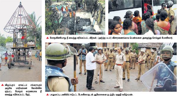விழுப்புரம் மாவட்டம் சங்கராபுரம் அருகே மாரியம்மன் கோயில் தேரோட்டத்தில் ஏற்பட்ட மோதலில் தேர் மற்றும் 4 வீடுகள் தீ வைத்து எரிக்கப்பட்டன. இதனால் வன்முறையைக் கட்டுப்படுத்த போலீஸார் வானத்தை நோக்கி துப்பாக்கியால் சுட்டனர். மேலும் 144 தடை உத்தரவும் பிறப்பிக்கப்பட்டுள்ளது.
