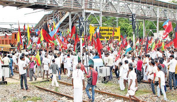 இதேபோல சிதம்பரத்தில் ரயில் மறியல் போராட்டம் நடந்தது. சுமார் 500 பேர் சிதம்பரம் காந்தி சிலையில் இருந்து ஊர்வலமாக சிதம்பரம் ரயில் நிலையம் சென்று சோழன் எக்ஸ்பிரஸ் ரயிலை மறித்து போராட்டத்தில் ஈடுபட்டனர். அப்போது போலீஸாருக்கும், கட்சியினருக்கும் இடையே தள்ளு முள்ளு ஏற்பட்டது. இதனால் ஆத்திரமடைந்த அரசியல் கட்சி யினர் போலீஸாரை கண்டித்து ரயில் நிலையத்துக்குள் கோஷங்களை எழுப்பினர்.