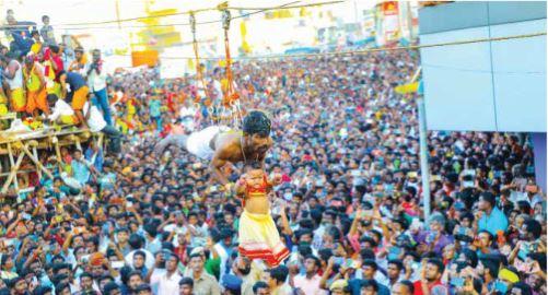பிற்பகலில் அம்மன் மயான சூறை ரதம் கோயிலில் இருந்து நகர்வலம் புறப்பட்டது. அலங்கரிக்கப்பட்ட தேரில் அங்காளம்மன், பூங்காவனத்தம்மன் ஊர்வலமாகப் புறப்பட்டு, காவேரிப்பட்டணம் நகரின் முக்கிய வீதிகள் வழியாக வலம் வந்து பக்தர்களுக்கு அருள்பாலித்தனர். அப்போது வீதியின் இருபுறமும் திரண்டிருந்த பக்தர்கள், அம்மன் தரிசனம் செய்தனர். 100 அடி தூரத்துக்கு பக்தர்கள் அந்தரத்தில் தொங்கியபடி வந்து அம்மனுக்கு தீபாராதனை மற்றும் மலர் தூவி வழிபாடு நடத்தினர். பக்தர்கள் அந்தரத்தில் தொங்கியபடி குழந்தைகளை தூக்கி வந்து அம்மனை வழி பட்டனர். இதனைத் தொடர்ந்து அம்மன் தேர் தென்பெண்ணை ஆற்றுப் பாலத்தைக் கடந்து ஆற்றங்கரையைச் சென்றடைந்தது.