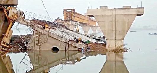 இந்நிலையில், இந்தப் பாலத்தில், 16 மற்றும் 17-வது தூண்களை கான்கிரீட் காரிடர் மூலம் இணைக்கும் பணியில் நேற்று அதிகாலை 15 தொழிலாளர்கள் ஈடுபட்டிருந்தனர். அப்போது, 12 அடி அகலம், 50 மீட்டர் நீளமுள்ள கான்கிரீட் காரிடரை ஜாக்கி கிரேன் மூலம் தூக்கி, தூண்கள் மீது வைப்பதற்காக கொண்டு சென்றபோது, கான்கிரீட் காரிடரில் பொருத்தப்பட்டிருந்த கிரேன் கம்பி அறுந்ததால், காரிடர் கீழே விழுந்தது. உடனே, தொழிலாளர்கள் தண்ணீரில் குதித்து உயிர்த் தப்பினர். இதில் யாருக்கும் காயம் ஏற்படவில்லை. இச்சம்பவத்தில், புதிதாக கட்டப்பட்டு வரும் பாலம், அதன் தூண்கள் சிறிய அளவில் இடிந்து, சேதமடைந்தன.